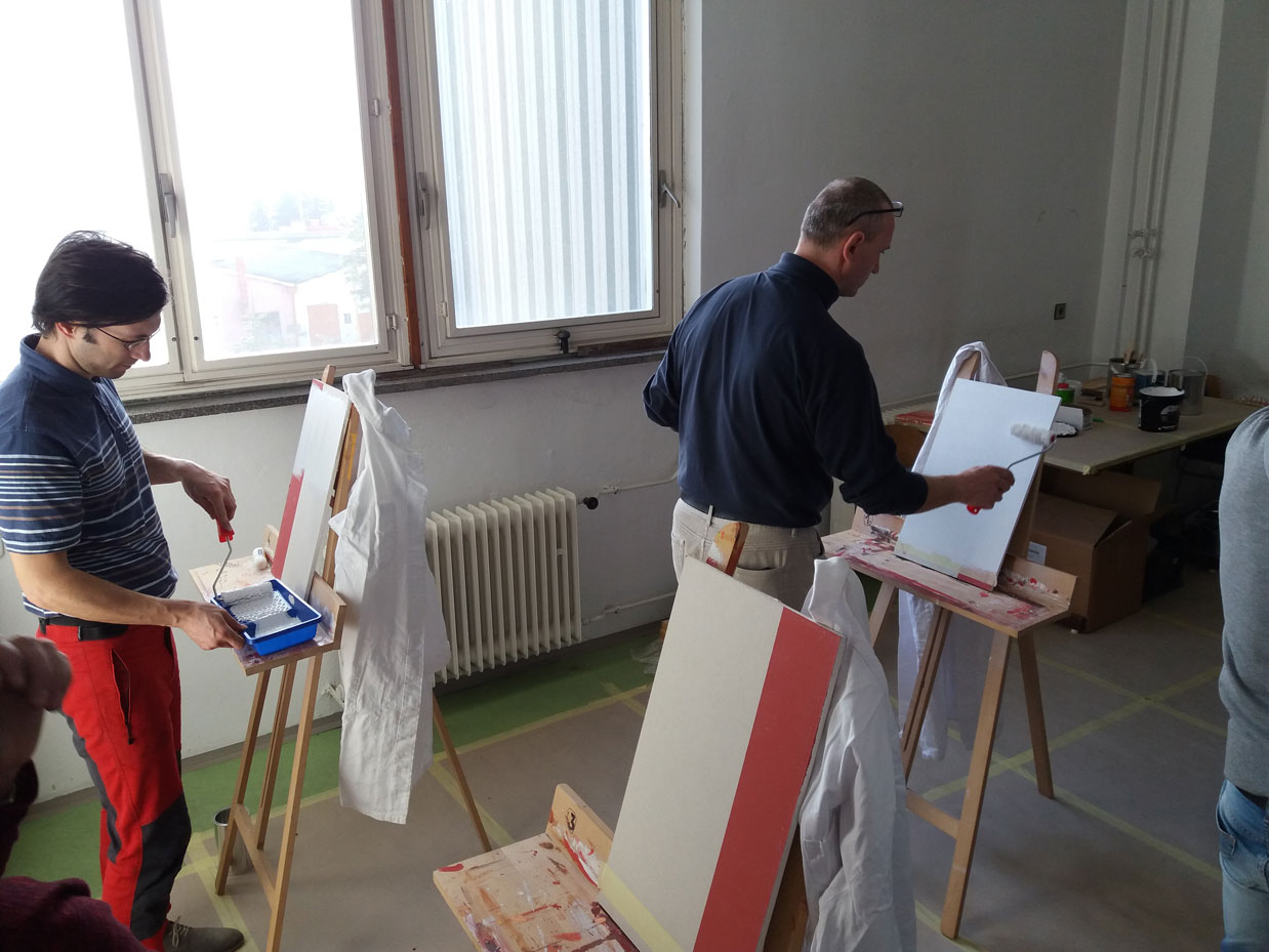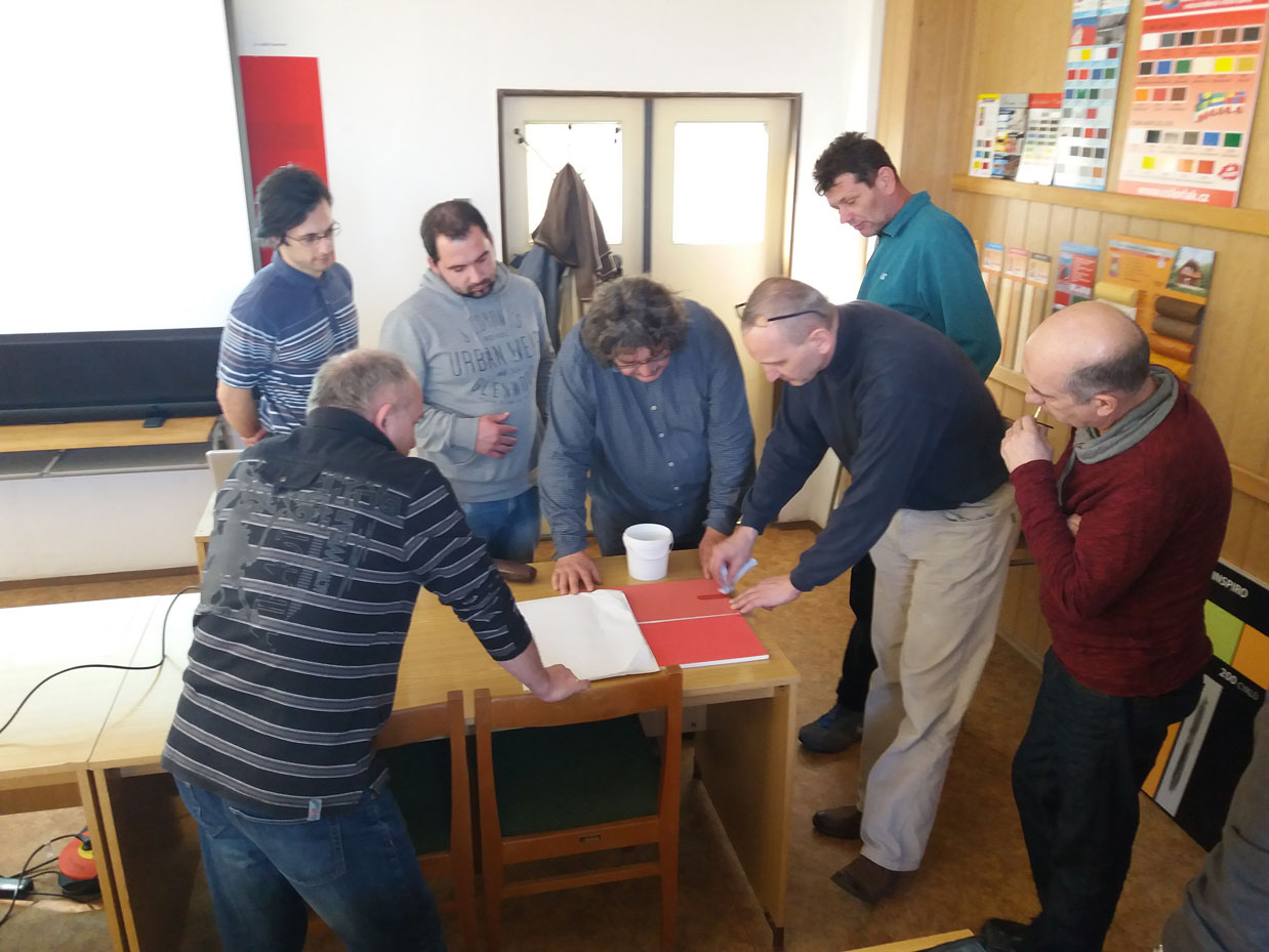 Odpoledním programem byla teoretická prezentace o Dekorativních malířských barvách a stupních jejich oděrů za mokra, doprovázená praktickou zkouškou kryvosti a oděru.