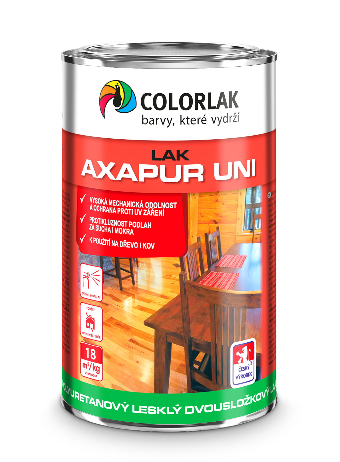 - Lak poskytuje nežloutnoucí, tvrdý, lesklý, velmi odolný film, který je vhodný pro povrchovou úpravu namáhaných dřevěných a parketových podlah, schodů a schodišť – atest na protikluznost za sucha i mokra.
