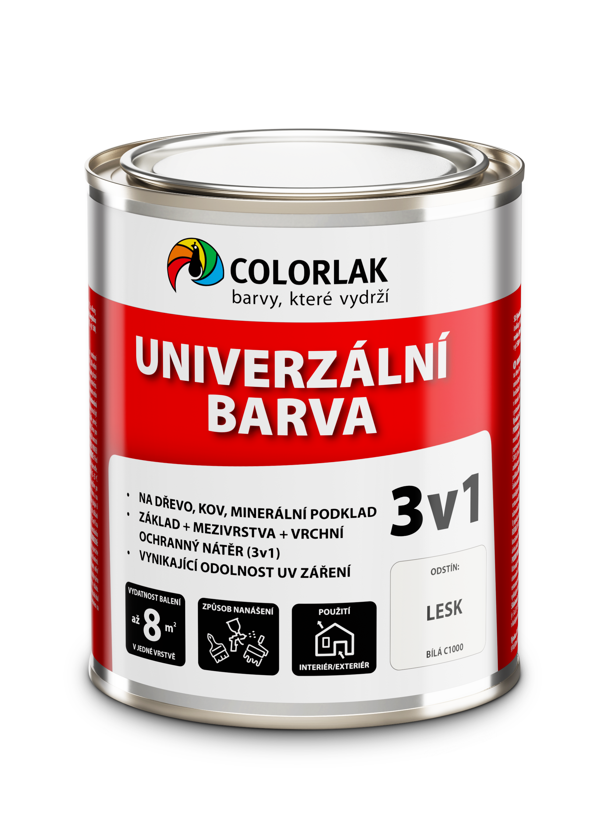 - Lesklá UNIVERZÁLNÍ BARVA 3v1 slouží jako jednovrstvá barva pro venkovní i vnitřní nátěry na dřevo, kov (mimo pozink a lehké kovy), jako jsou např. dřevěná okna, dveře, ploty, zahradní nábytek, chaty, zahradní stavby, různé kovové konstrukce, oplocení, vrata, okapy, parapety, zábradlí, zárubně apod. Barva má vynikající odolnost na povětrnosti a vysoký lesk